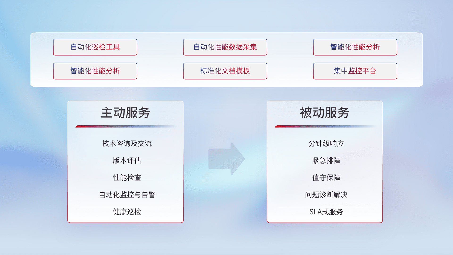 智能化工具和标准化文档,,,,保障服务质量,,,,提供主动服务(包含技术咨询、、版本评估、、性能检查、、、自动化监控与告警、、、、健康巡检)和被动服务包含(分钟级响应、、、、紧急排障、、值守保障、、、问题诊断解决、、SLA服务)。。。